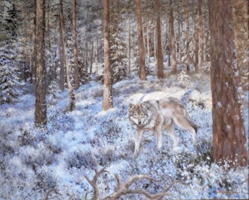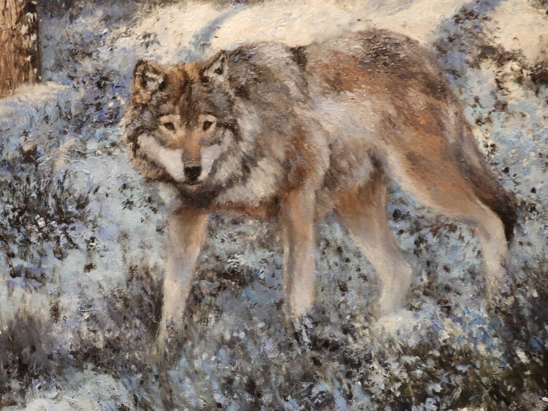 Elg blir jaget av ulver i dyp snø, oljemaleri.